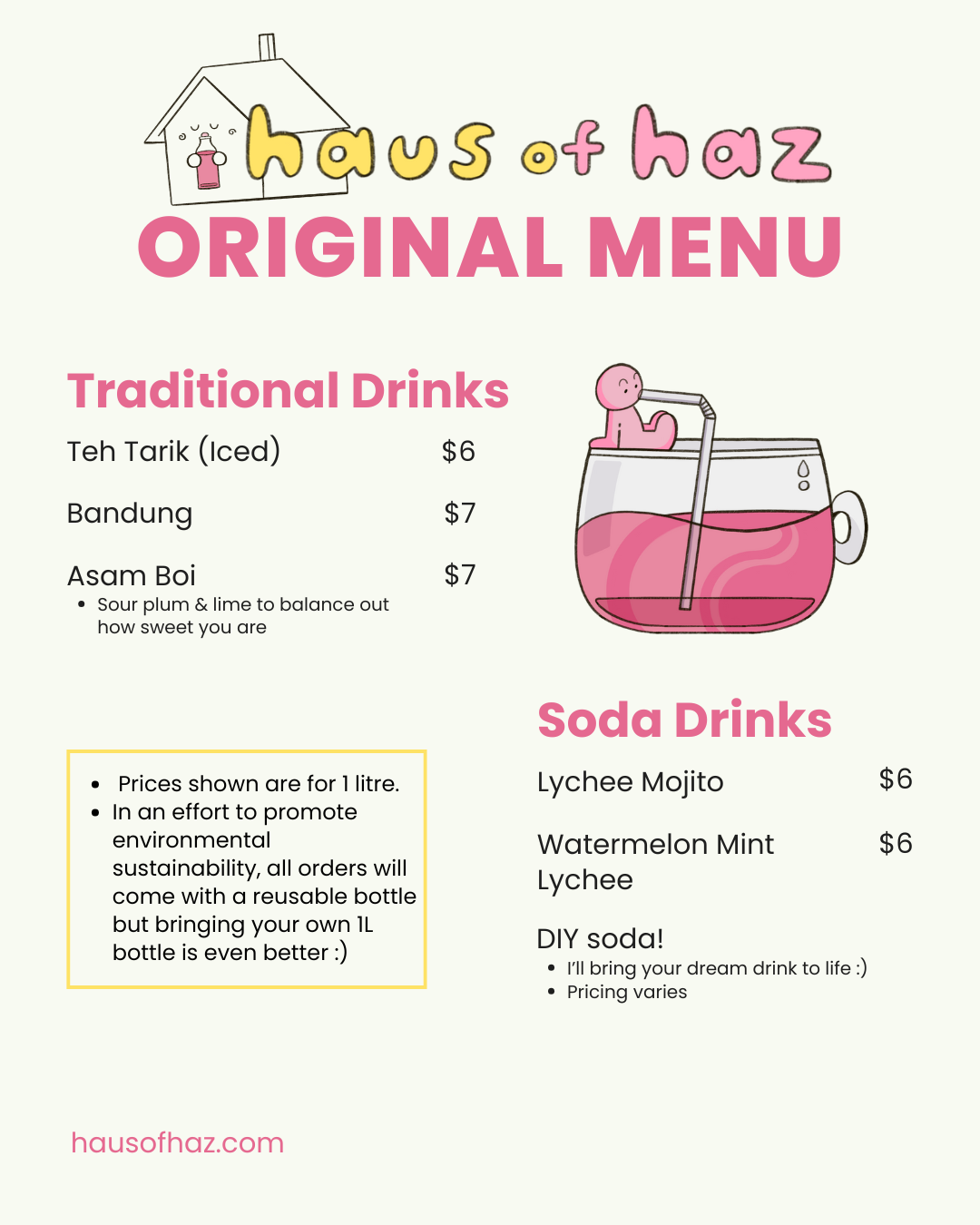 Yes of course!! While I'm not actively promoting my original menu (soda & non-soda drinks), orders are still open! Do note that in an effort to promote environmental sustainability, all drinks will come in a 1L reusable bottle (which you can keep) but it is advised to provide your own bottle! #BYOB